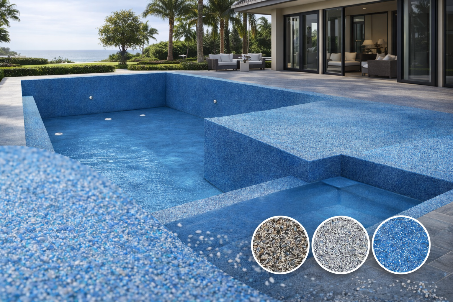 Son arenas de cuarzo pigmentadas en diversos colores que al mezclarse con la resina crean un recubrimiento decorativo y muy resistente, puede aplicarse como riego de cuarzo y como acabado al alto, puede ser rugoso o semi- rugoso dependiendo las necesidades del cliente es un excelente recubrimiento decorativo que puede aplicarse en interiores o exteriores.